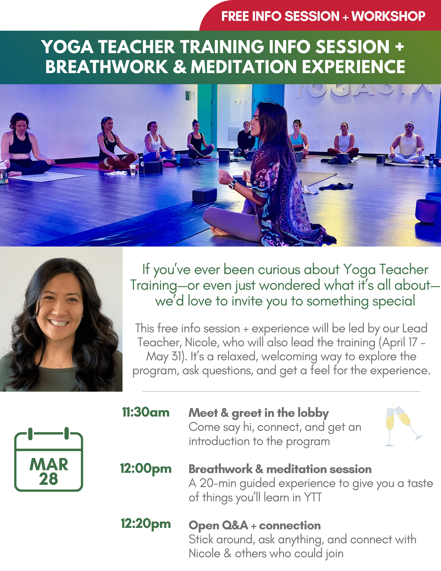 Our 200-hour Yoga Teacher Training begins April 17th, and we’re hosting a free information session and workshop where you can learn more and ask any questions!